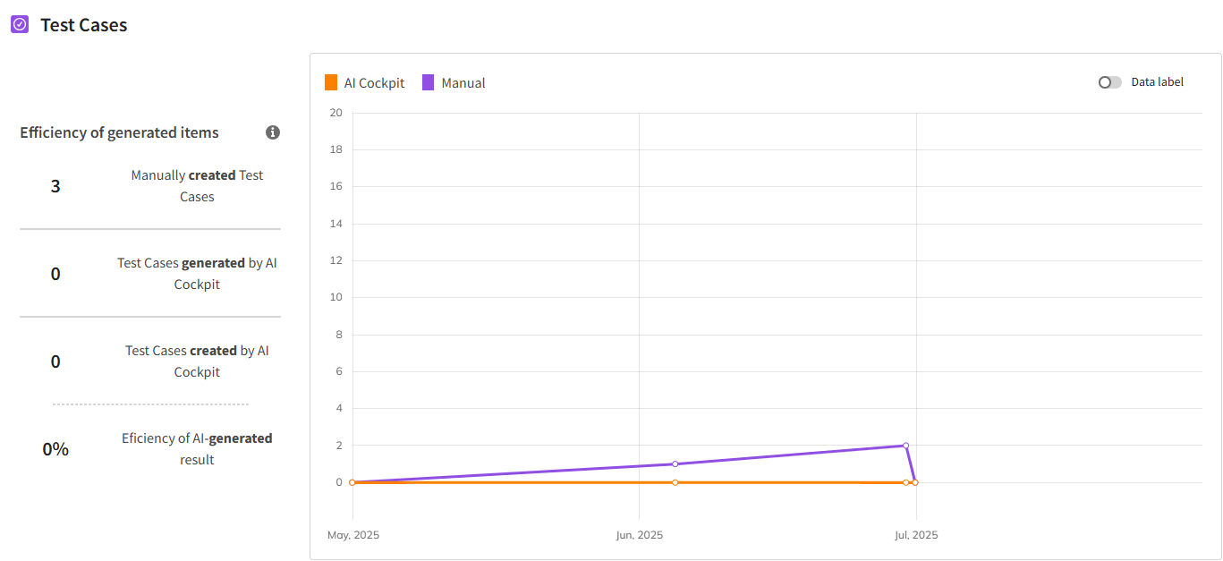 After applying the filters, the following metrics for "Test Cases" are displayed, showing the efficiency of AI in generating test cases.