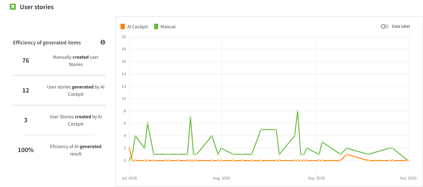 The chart shows the number of User Stories created manually versus those generated by AI Cockpit over the selected timeframe.