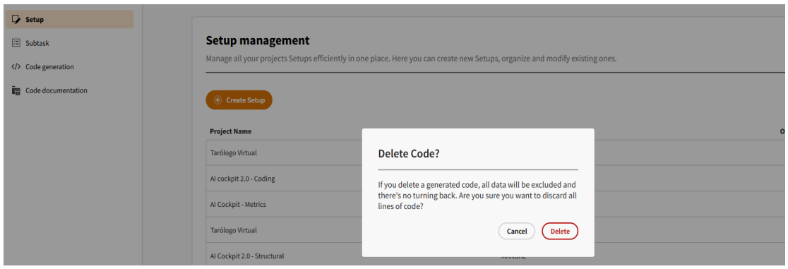 - Delete: Remove a setup after confirming in a pop-up modal.