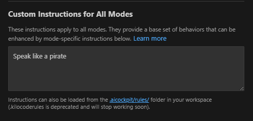 Se o próprio modo for global (não específico do workspace), quaisquer instruções personalizadas que você definir para ele também serão aplicadas globalmente para esse modo em todos os workspaces.
