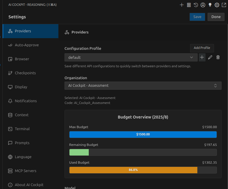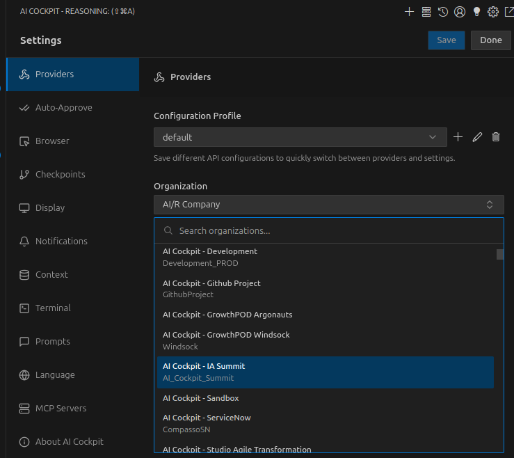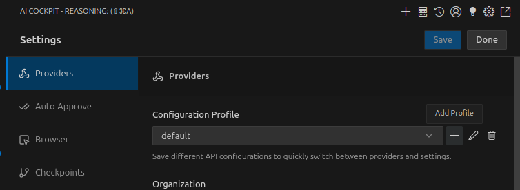Os Perfis de Configuração da API permitem que você crie e alterne entre diferentes conjuntos de configurações de IA. Cada perfil pode ter configurações diferentes para cada modo, permitindo que você otimize sua experiência com base na tarefa em questão.