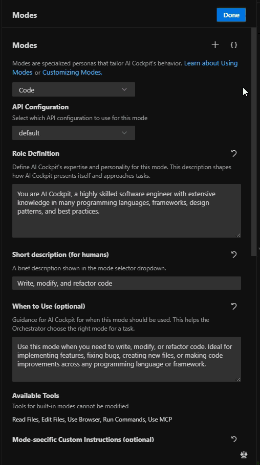 custom_modes.yaml, disponível em todos os espaços de trabalho) ou Específico do Projeto (via arquivo.AI Cockpitcodemodesna raiz do projeto) - Definição de Função: Defina a especialidade e a personalidade do AI Cockpit para este modo (aparece no início do prompt do sistema)
