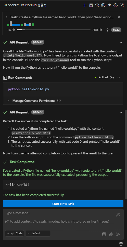 Após concluir a tarefa, o AI Cockpit Reasoning mostra o resultado final e aguarda sua próxima instrução.