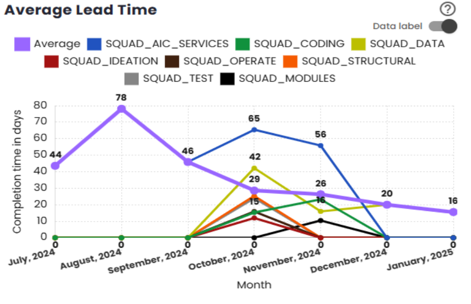 Este indicador apresenta a evolução do Lead Time das squads ao longo do tempo. O Lead Time é definido como o tempo total decorrido entre a criação de uma issue e sua conclusão. O gráfico exibe a média do Lead Time das squads, permitindo acompanhar as variações ao longo do período analisado. A média calculada desconsidera as pontuações zeradas no mês, garantindo que a análise seja baseada apenas nos dados relevantes, proporcionando uma visão precisa do tempo necessário para a conclusão das tasks pelas squads.