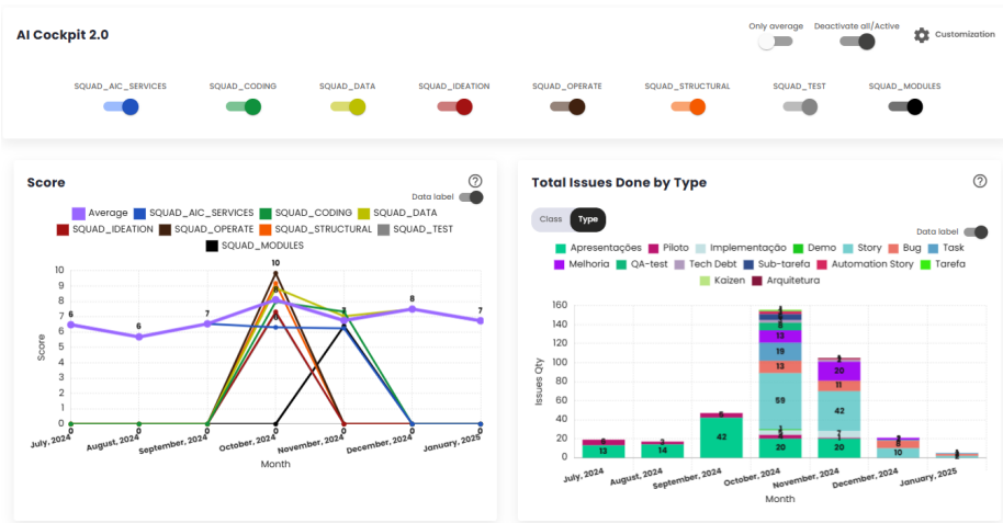 Este indicador exibe o total de issues completas por tipo concluídas por todas as squads durante um mês específico. Ele soma o número de issues entregues, separando-as por tipo, para fornecer uma visão geral do volume de trabalho concluído. Por exemplo, se em um determinado mês a Squad A entregou 5 Stories e a Squad B entregou 4 Stories, o gráfico mostrará um total de 9 Stories completas. Esse indicador ajuda a monitorar o progresso das squads em relação às entregas, oferecendo uma visão consolidada da produtividade das equipes no período.
