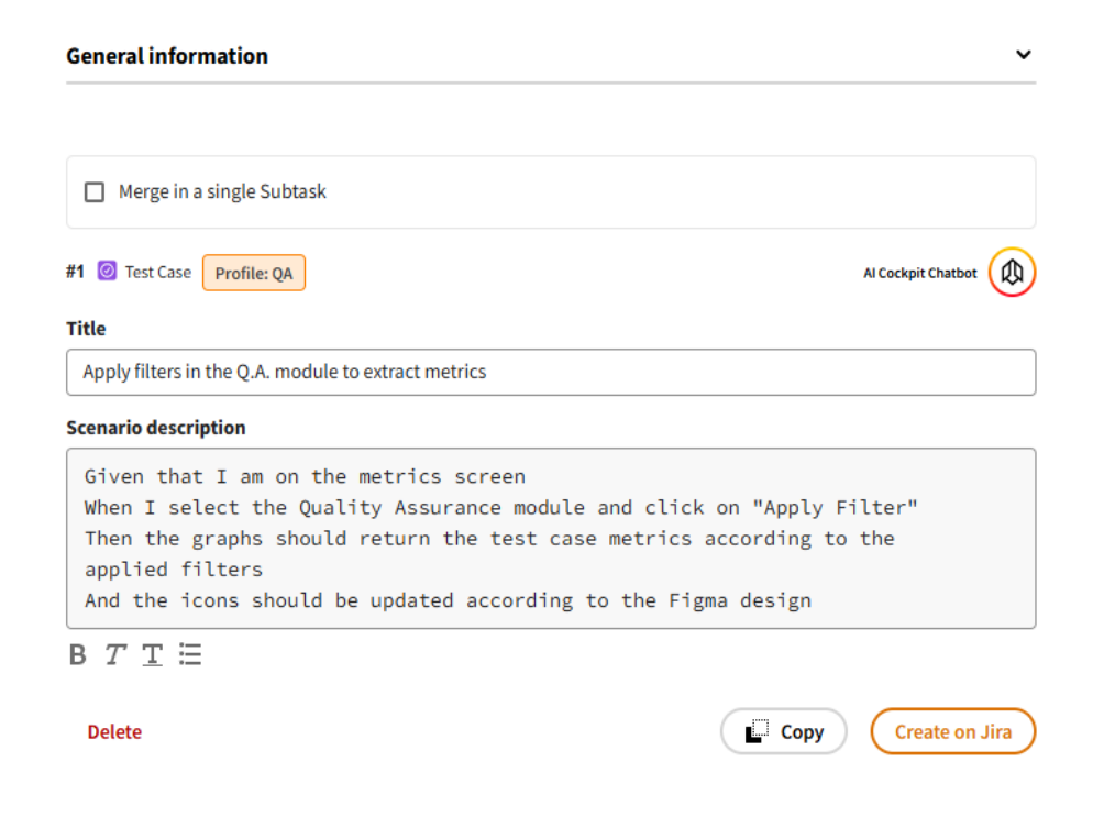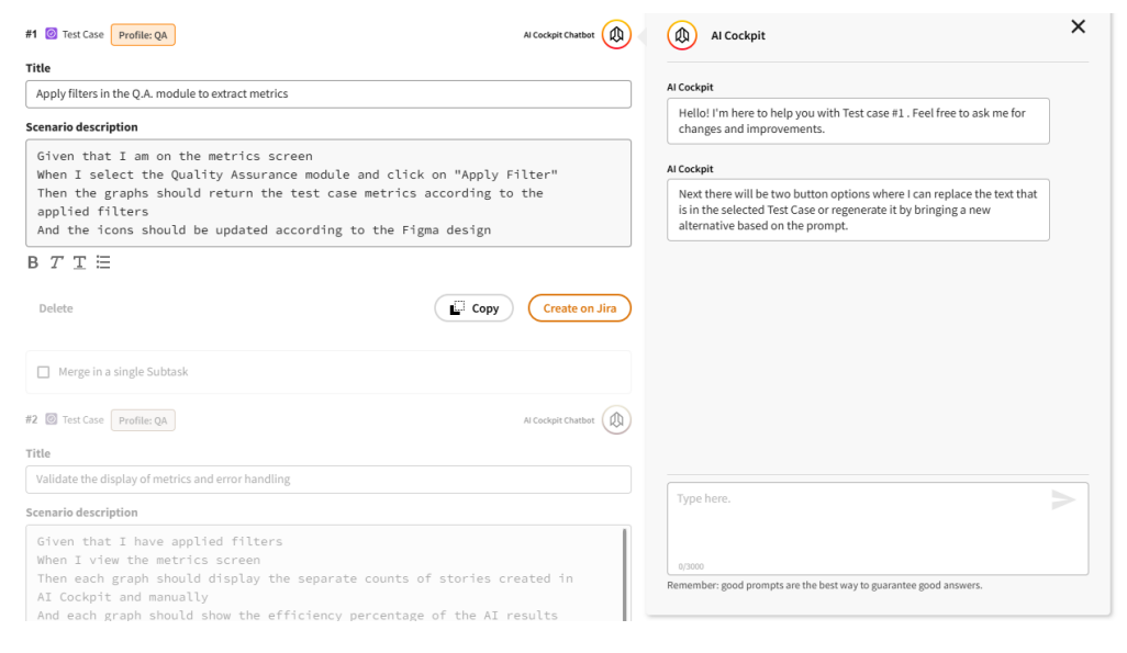 O módulo de Análise de Qualidade ajuda você a criar casos de teste detalhados a partir de histórias de usuário, otimizando seu processo de teste para maior eficiência.