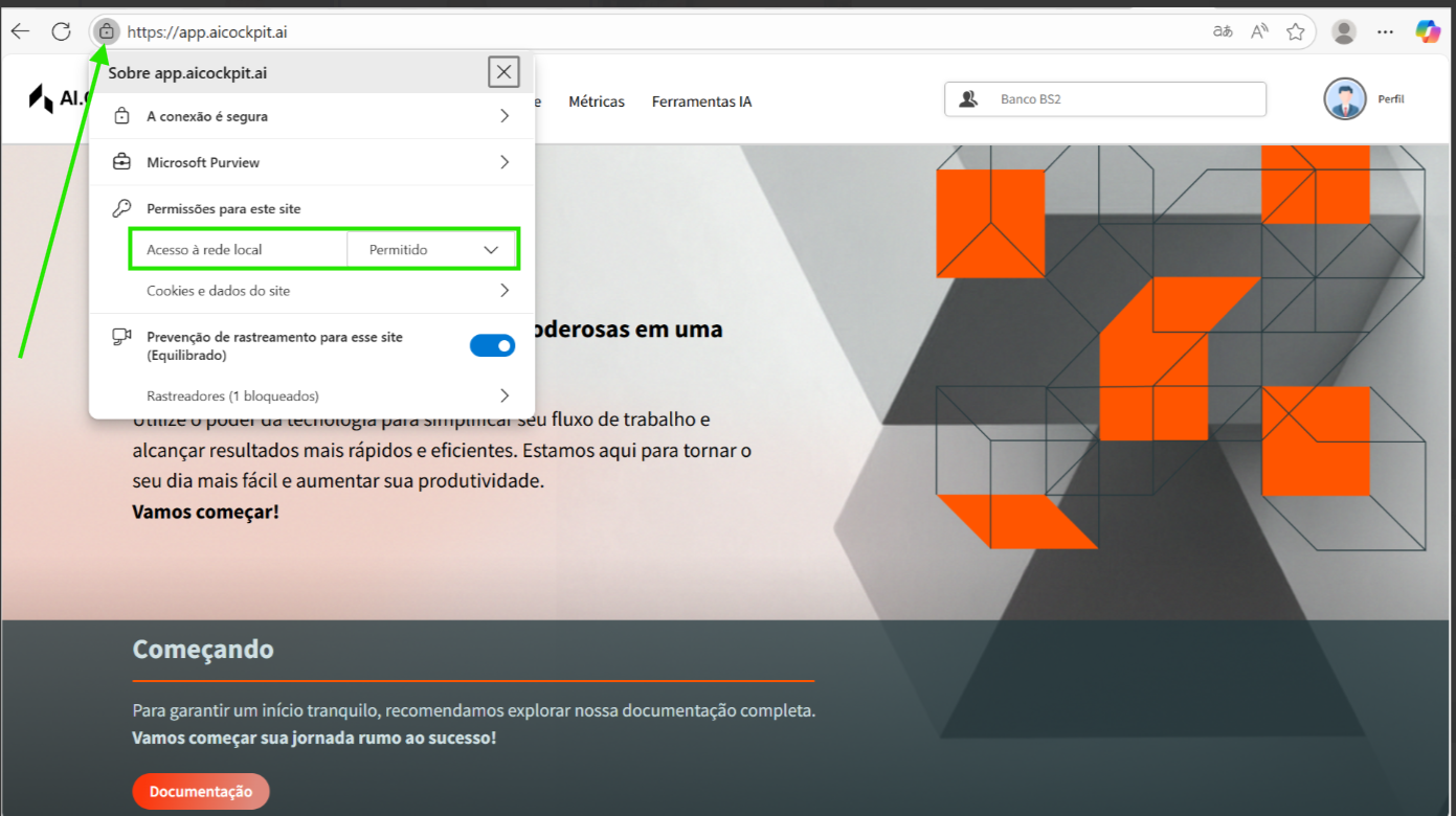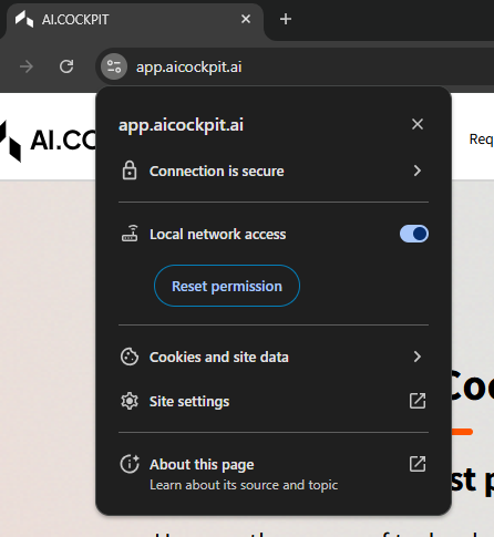 To resolve this issue, you need to enable "Access to local network" permission for the AI Cockpit website in your browser: